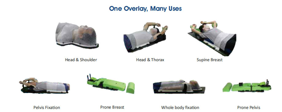 Specification: • Flexible with several parts: AIO Overlay, Overhead Arm Positioner, KneeFix, Belly Bridge, Knee Bridge, Prone Breast/Pelvis Cushions • 124cm (Length) x 54cm (Width)
